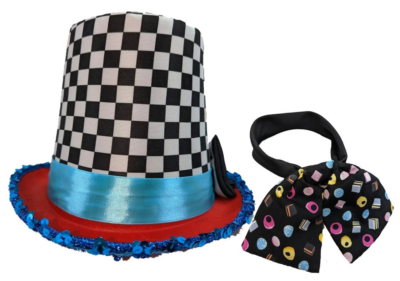 Adults Mad Hatter Checkered Stove Pipe Top Hat & Cravat