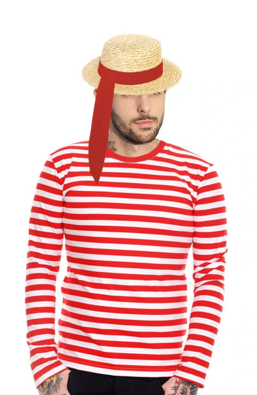 Here we have the adults unisex venetian gondola Costume kit, The set Includes a Red and White Striped Long sleeved Top, Straw Boater With Black Band & Red Sash To Wrap Round your hat or Neck… Ideal for Around the World Fancy Dress, Italian Parties and Loads more! Made from 100% Polyester (Excluding Straw hat)