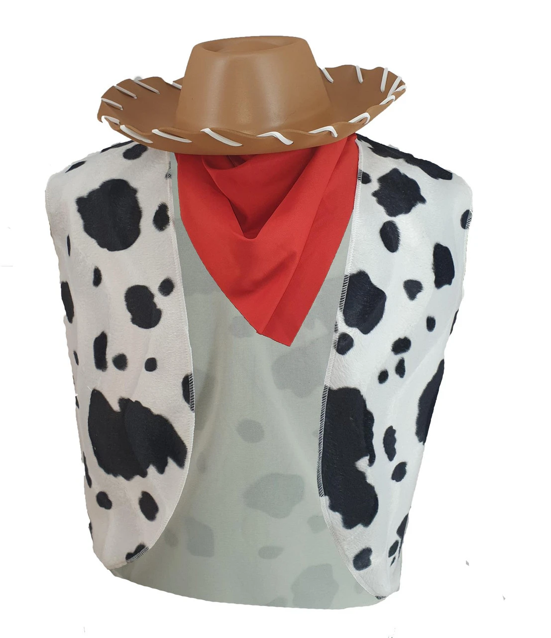 Includes: Cow Print Waistcoat, Wild Rag (Neckerchief) & Foam Woody Hat