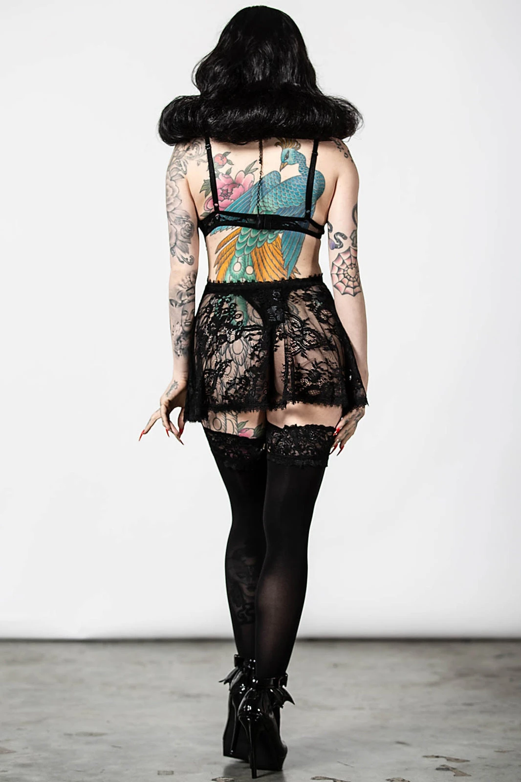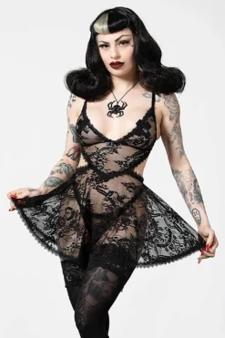 Be a hellfire of beauty in our ‘Afterlife’ nightdress. Crafted in super soft, stretch lace with trim details and a metal snake charm. Features an adjustable hook and eye closure, cami straps and a flowing skater skirt. Perfect for play dates with the devil, dancing barefoot under the moon or a coven sleepover.