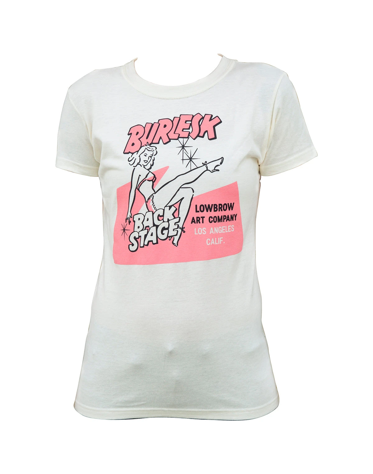 Feel like the babe you are in this adorable tee featuring a classic pin up ready to hit the stage, in a vintage pink ink, on a creamy off-white fitted tee