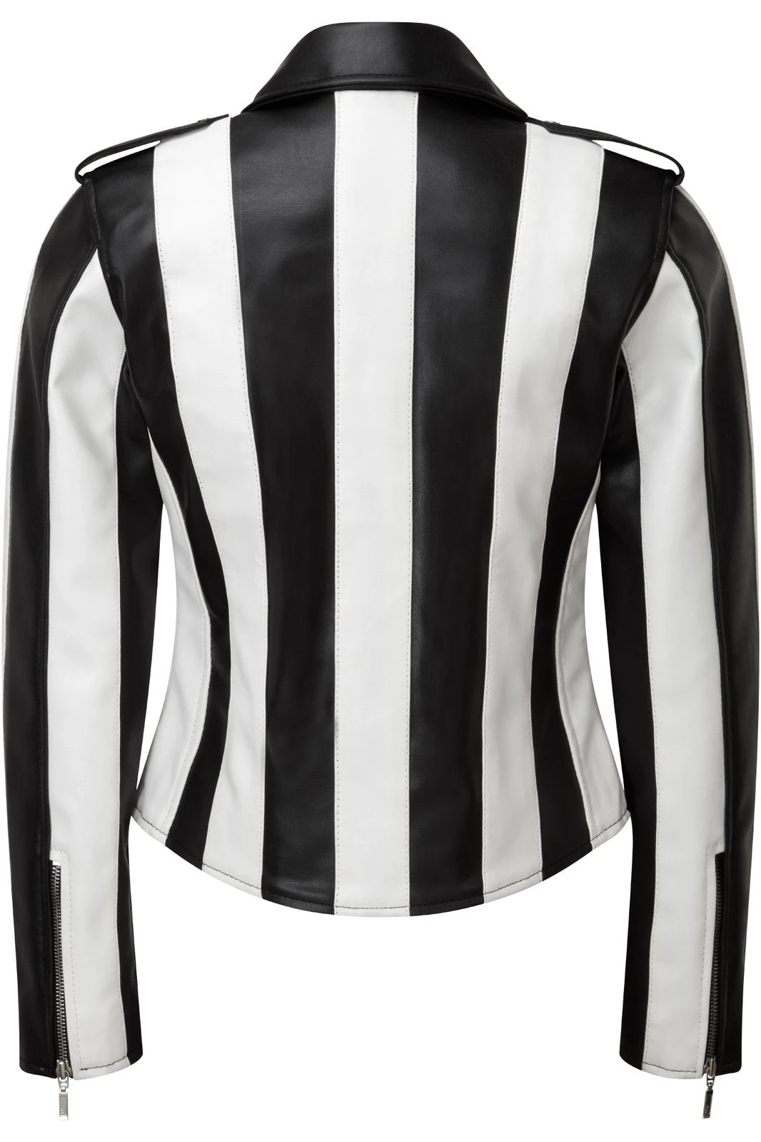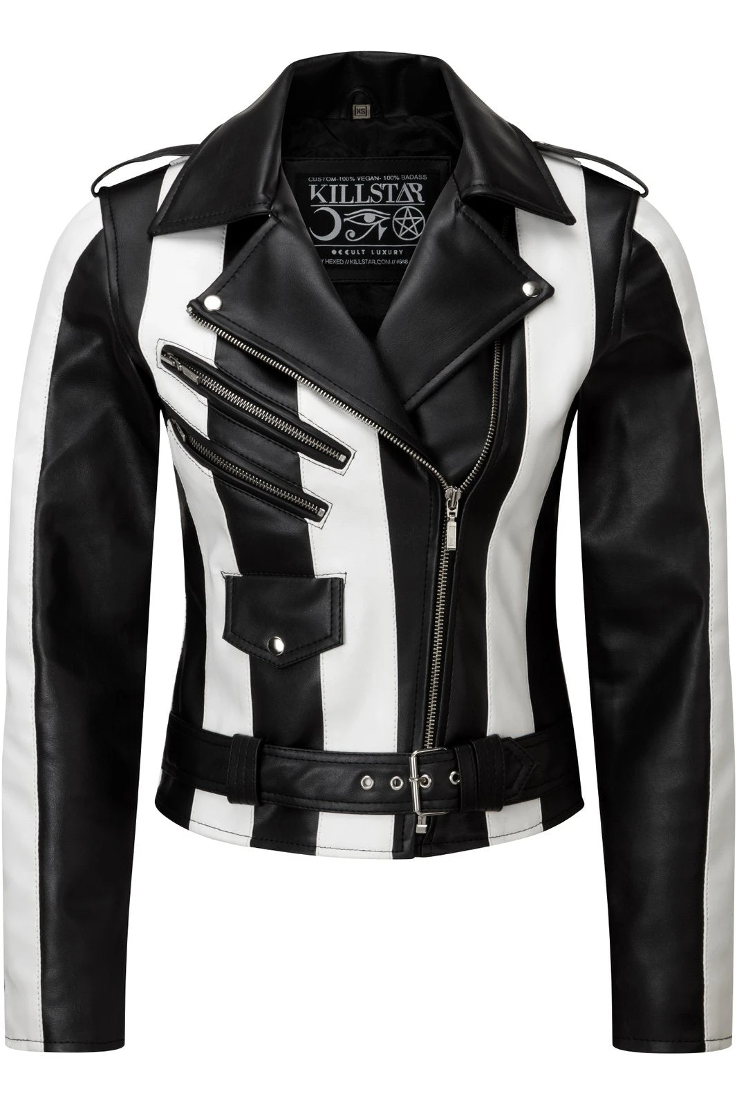 Classic biker jacket, with black & white contrasting vegan leather stripes. A-Grade Vegan leather, with all-black satin lining – this creature is another masterpiece. Hand-crafted.