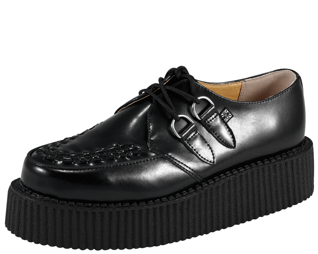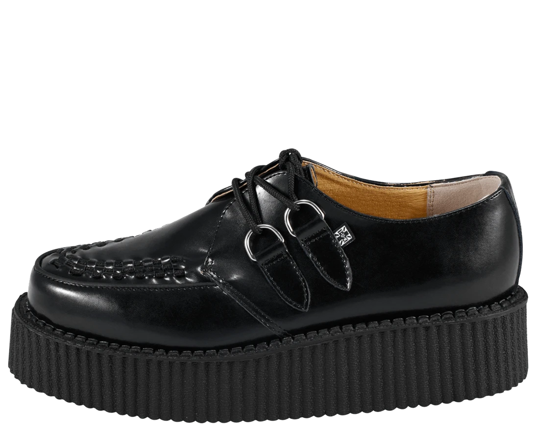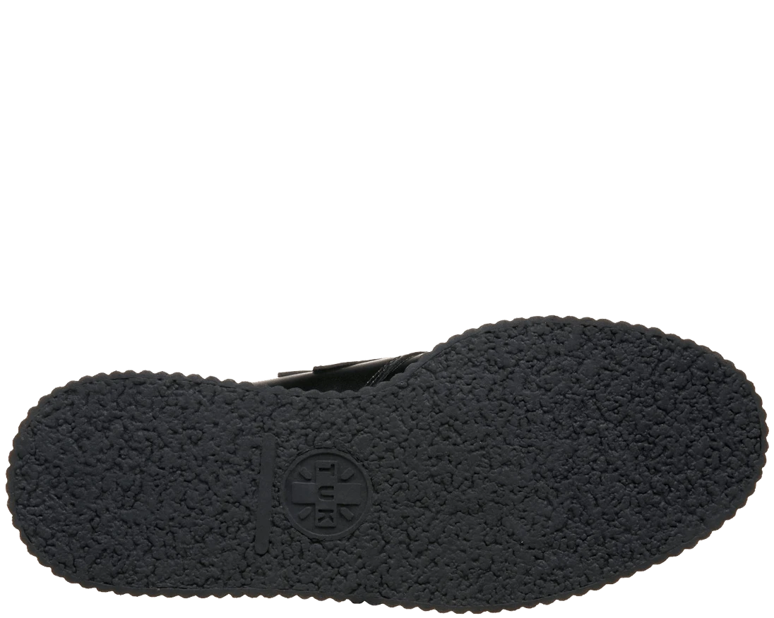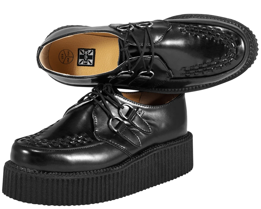 The Original T.U.K. Creepers with Classic Mondo Man Made Composition Sole. Black Leather, with Black Woven Interlace, and Silver Metal D-rings. The “Mondo” Creeper has a 1 7/8 inch Sole.