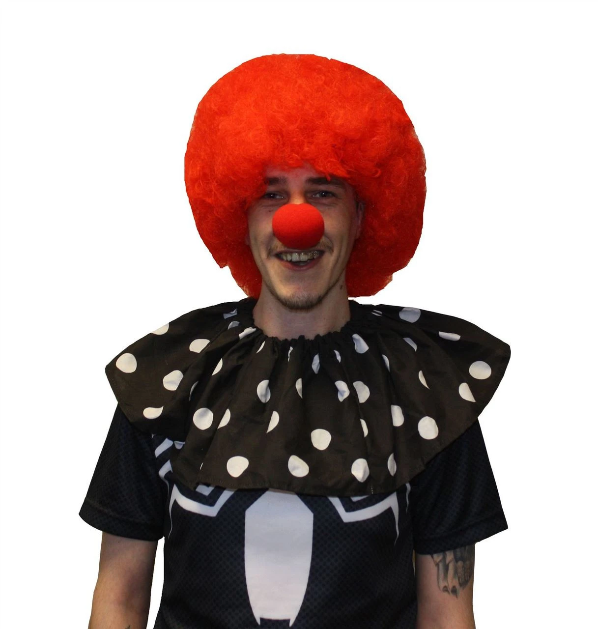 Black & White Polka Dot Clown Collar With Red Afro & Sponge Clown Nose