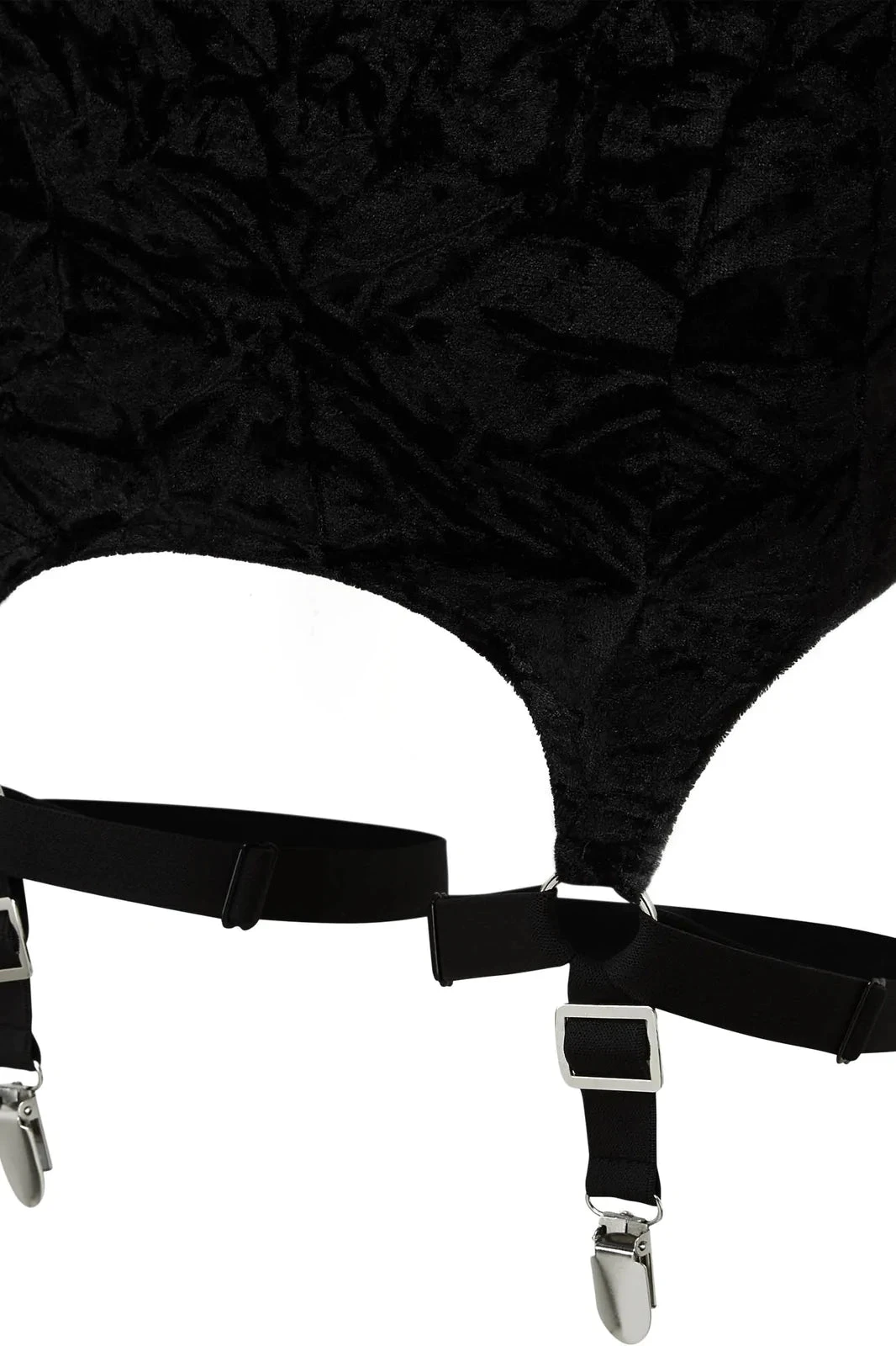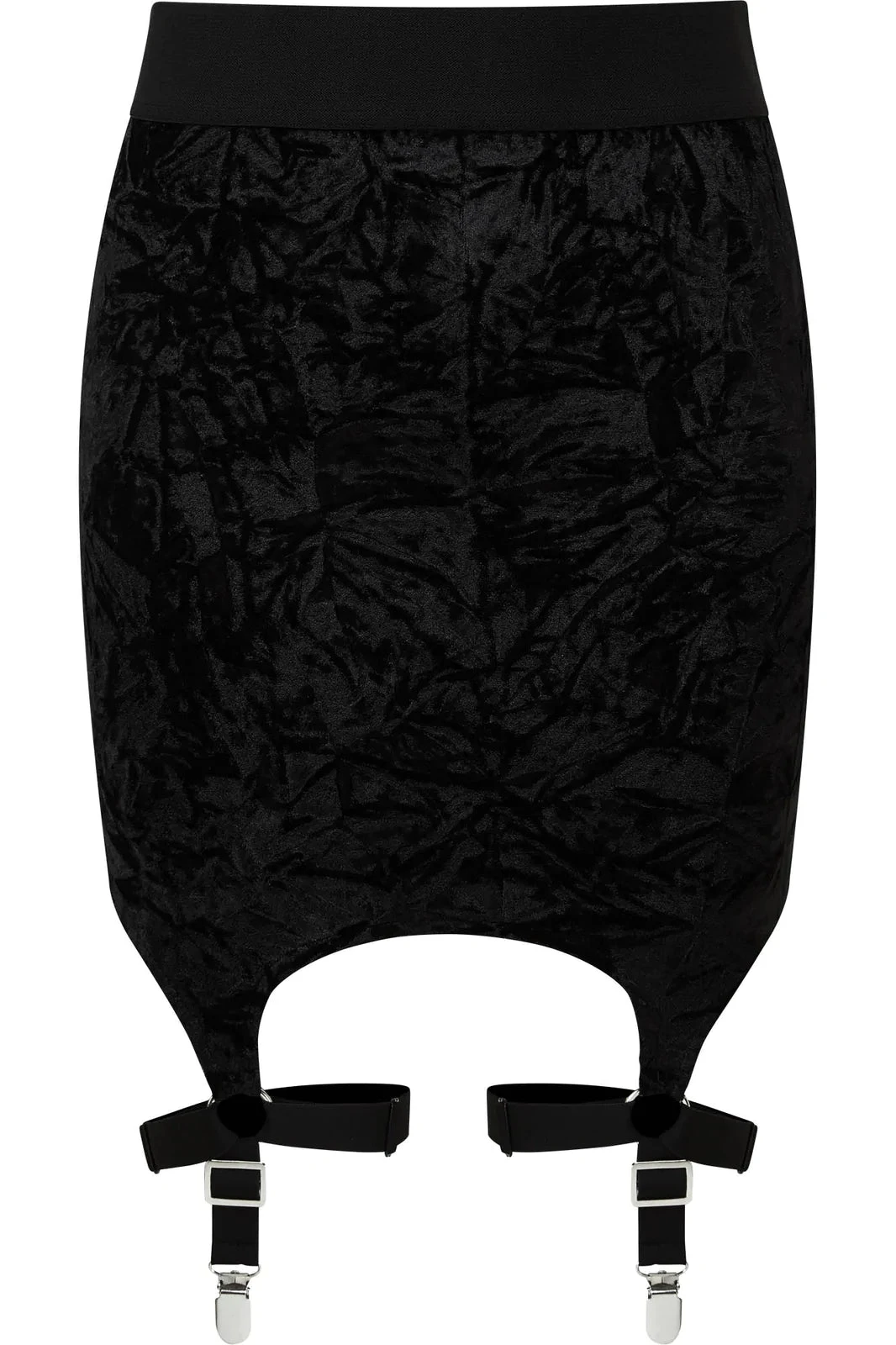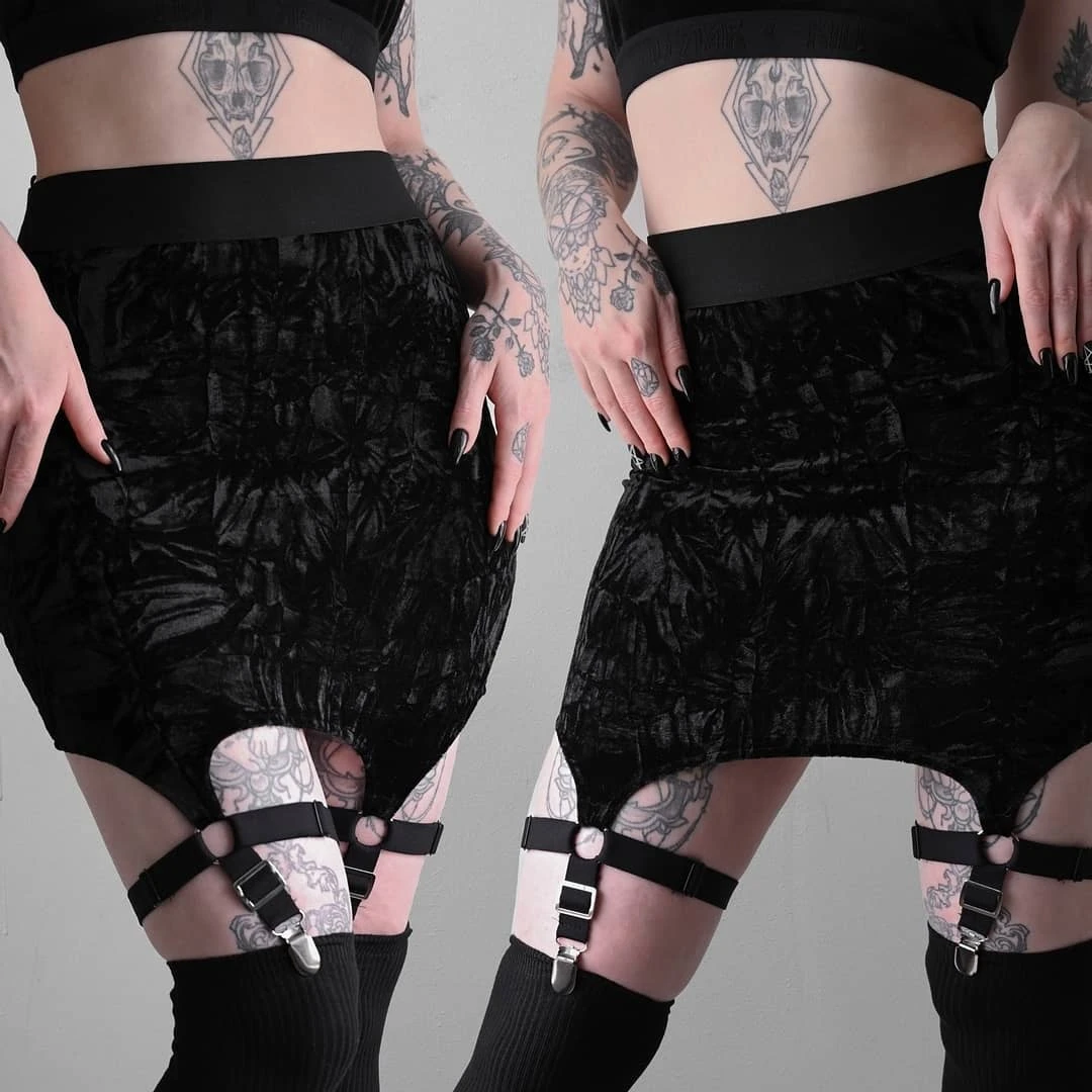 Rethink the classics and fall into the ‘Cassandra’ mini skirt – crafted from smooth and stretchy crushed-velvet, for a flattering fit and ultimate comfort. With a wide waistband and statement suspenders with an adjustable leg choker. An easy go-to piece that is oh-so-versatile! Sweet!