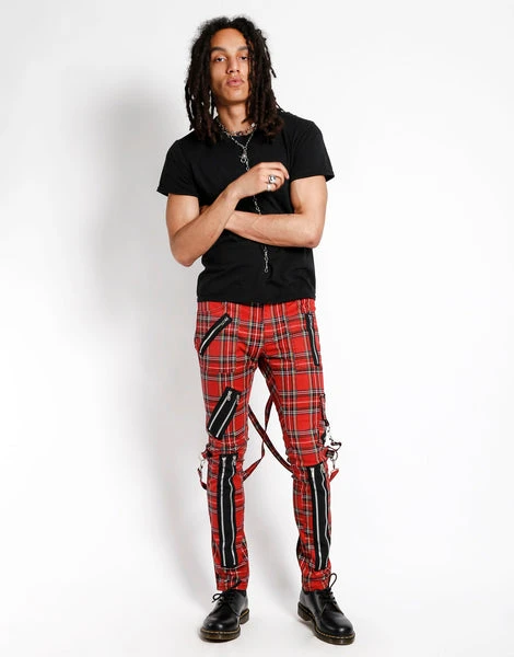 A punk rock wardrobe wouldn’t be complete without our classic slim leg pants with removable bondage straps and zipper details. Pant legs can be zipped for a change in fit, topped off with a zip fly and button closure.