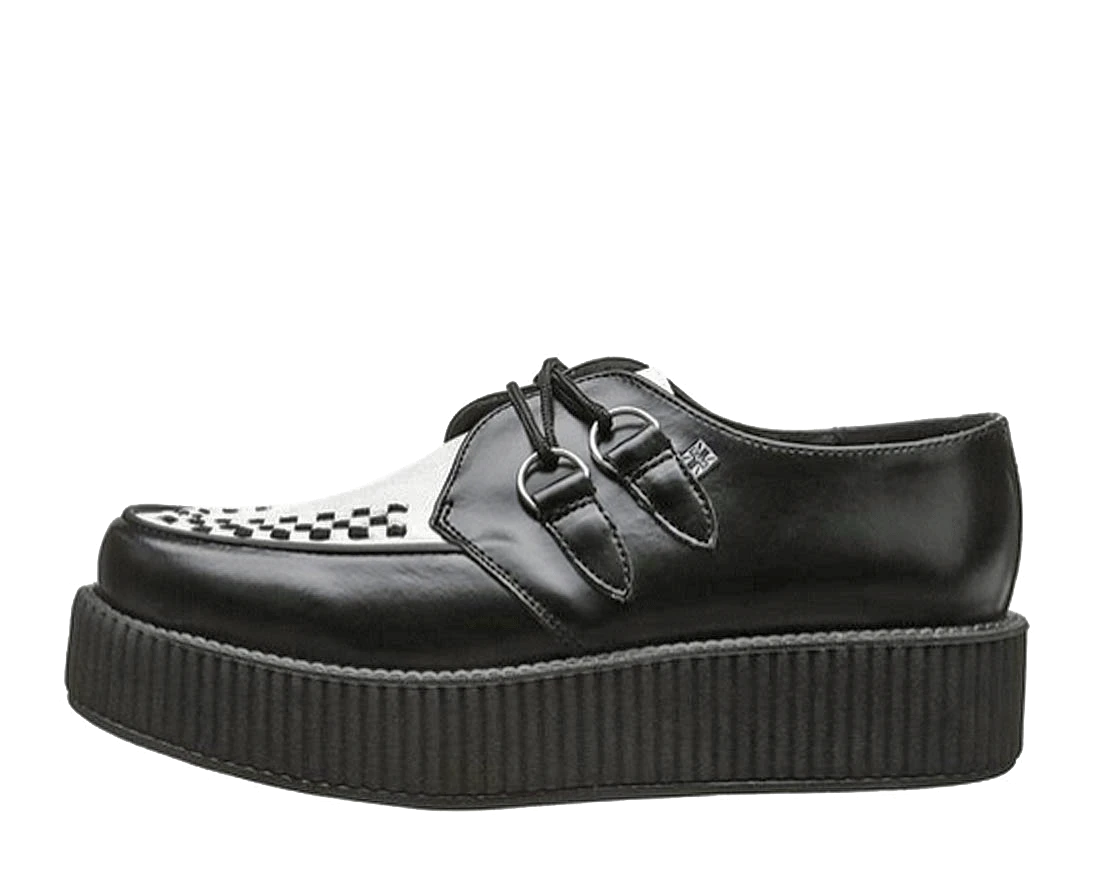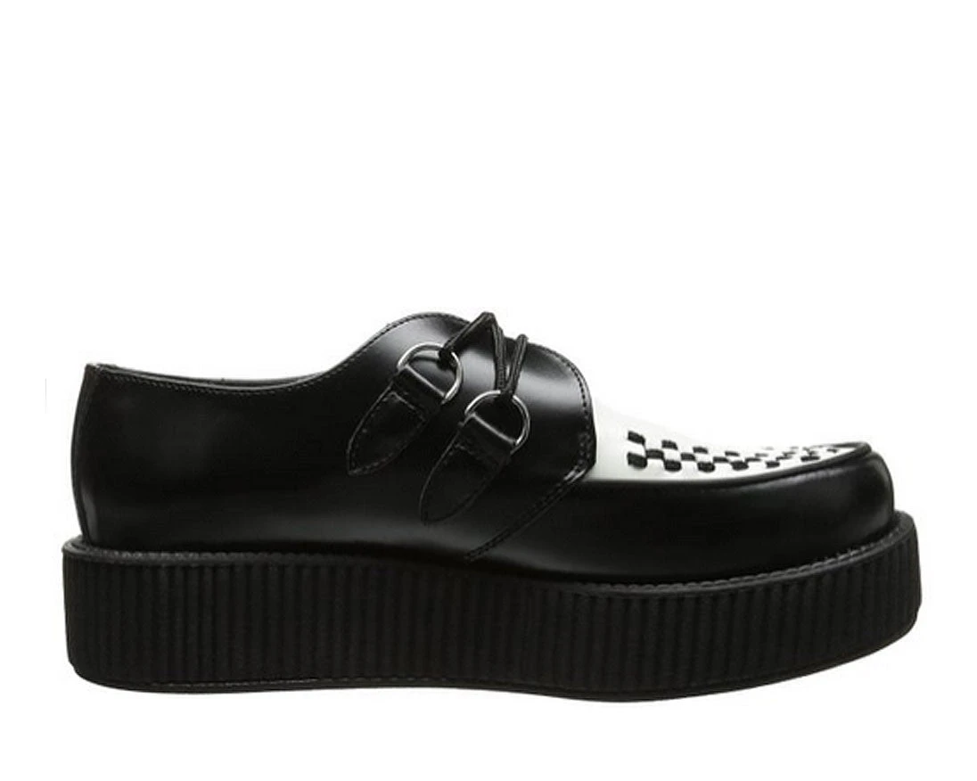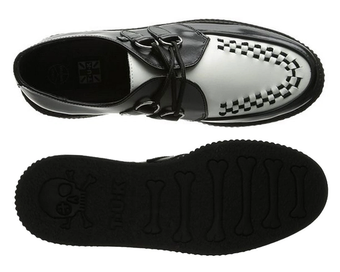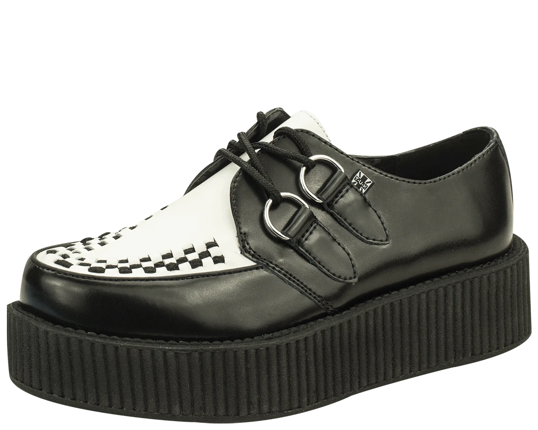 These black and white leather T.U.K. Viva Mondo Creepers look stylish and feel lighter than ever with the new lightweight and more flexible soles in our traditional 1 7/8″ Mondo height. These round toe creepers have a black woven interlace, and silver metal D-rings. Â