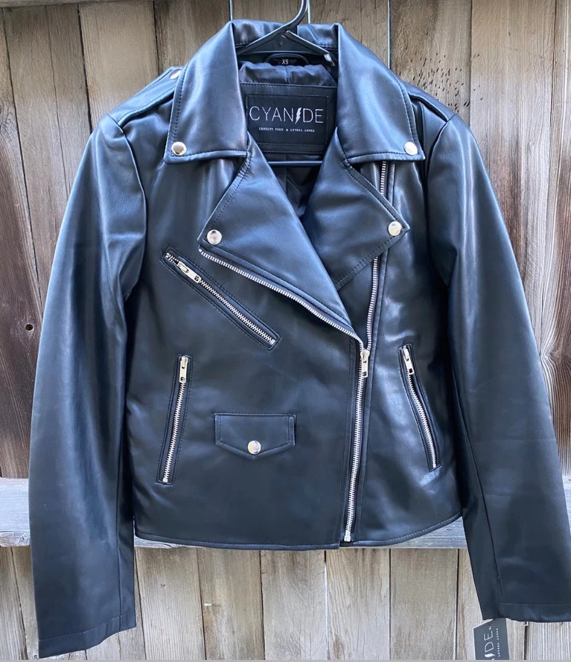This bad ass vegan leather motorcycle inspired jacket has all the bells & whistles! Featuring a high quality outer PU fabric, fully lined (in black of course), with double inside pockets, perfect for storing your phone, keys, etc at gigs, or while riding. All snaps are functional, and it also has 3 outer zipper pockets, plus a small snap pocket on the front. All the details on this jacket make it a staple that you will never want to take off!Â