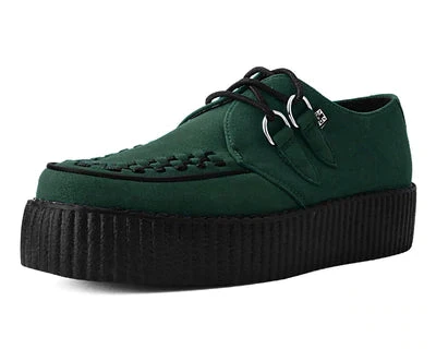 The Classics Never Go Out Of Style. These black suede T.U.K. Mondo Sole Viva Creepers feature the new lightweight and more flexible soles in our traditional 1 7/8″ height. These round toe creepers have a black woven interlace, and silver metal D-rings on our patented T.U.K. Skull n’ Bones creeper sole design.