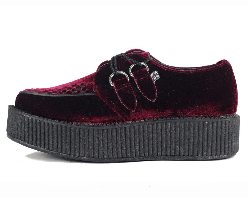 These Burgundy Velvet T.U.K. Round Toe Mondo Sole Viva Creepers feature our new lightweight & more flexible VIVA Creeper sole. These VEGAN creepers feature burgundy velvet throughout with black interlace, binding and silver metal d-rings for lacing up.