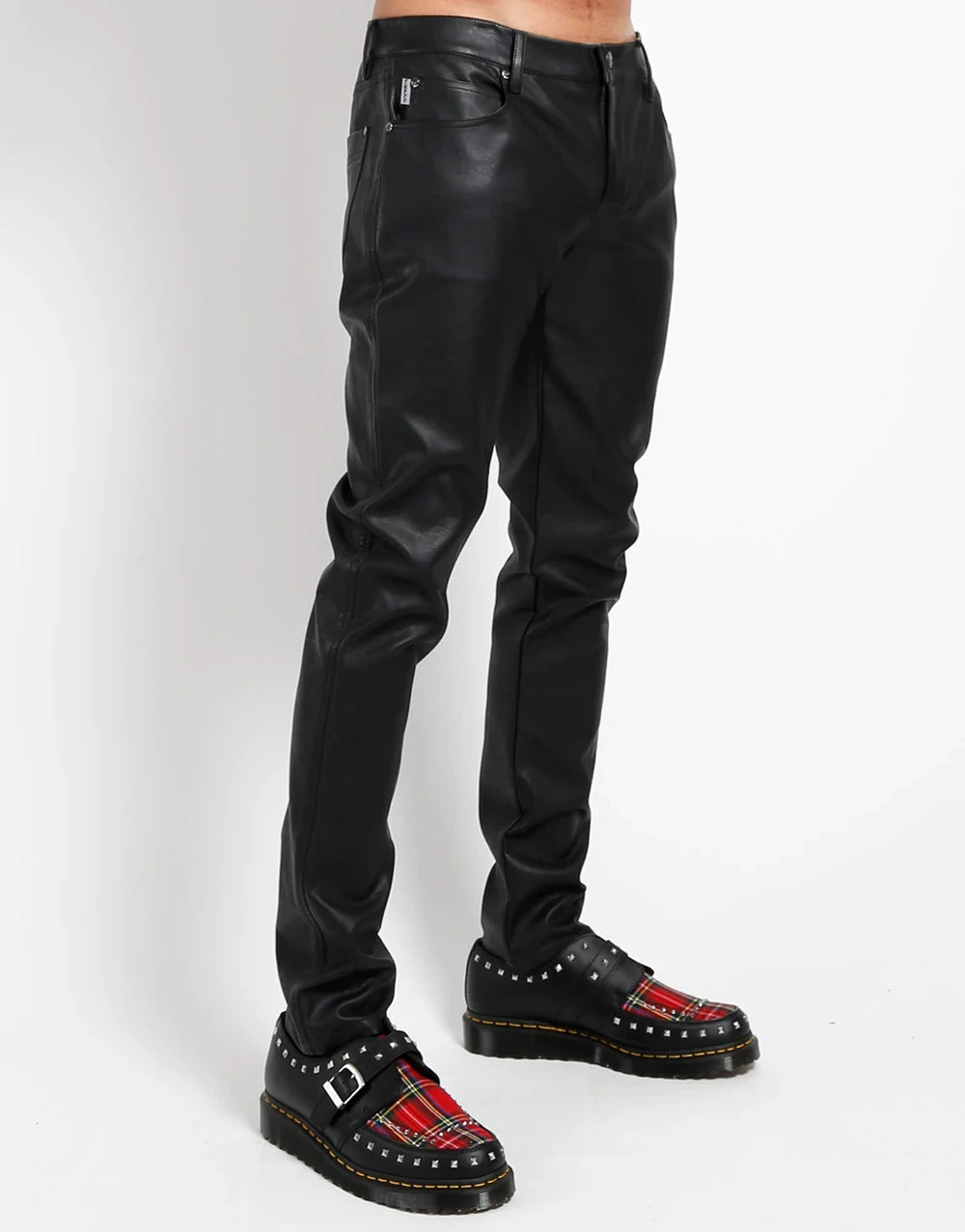 Fit for rock n’ roll royalty, these slim cut vegan leather pants, with skull rivets and a skinny fit, will have you looking stage ready.