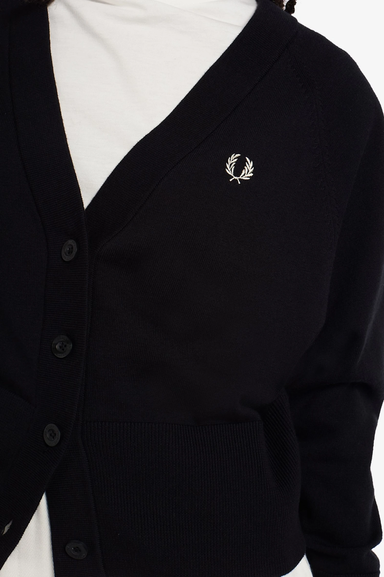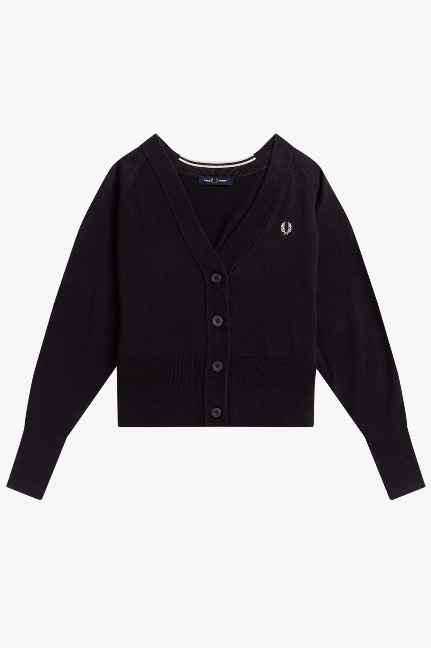 Our V-Neck cardigan, crafted from a soft merino wool and cotton blend and featuring signature Fred Perry detailing.