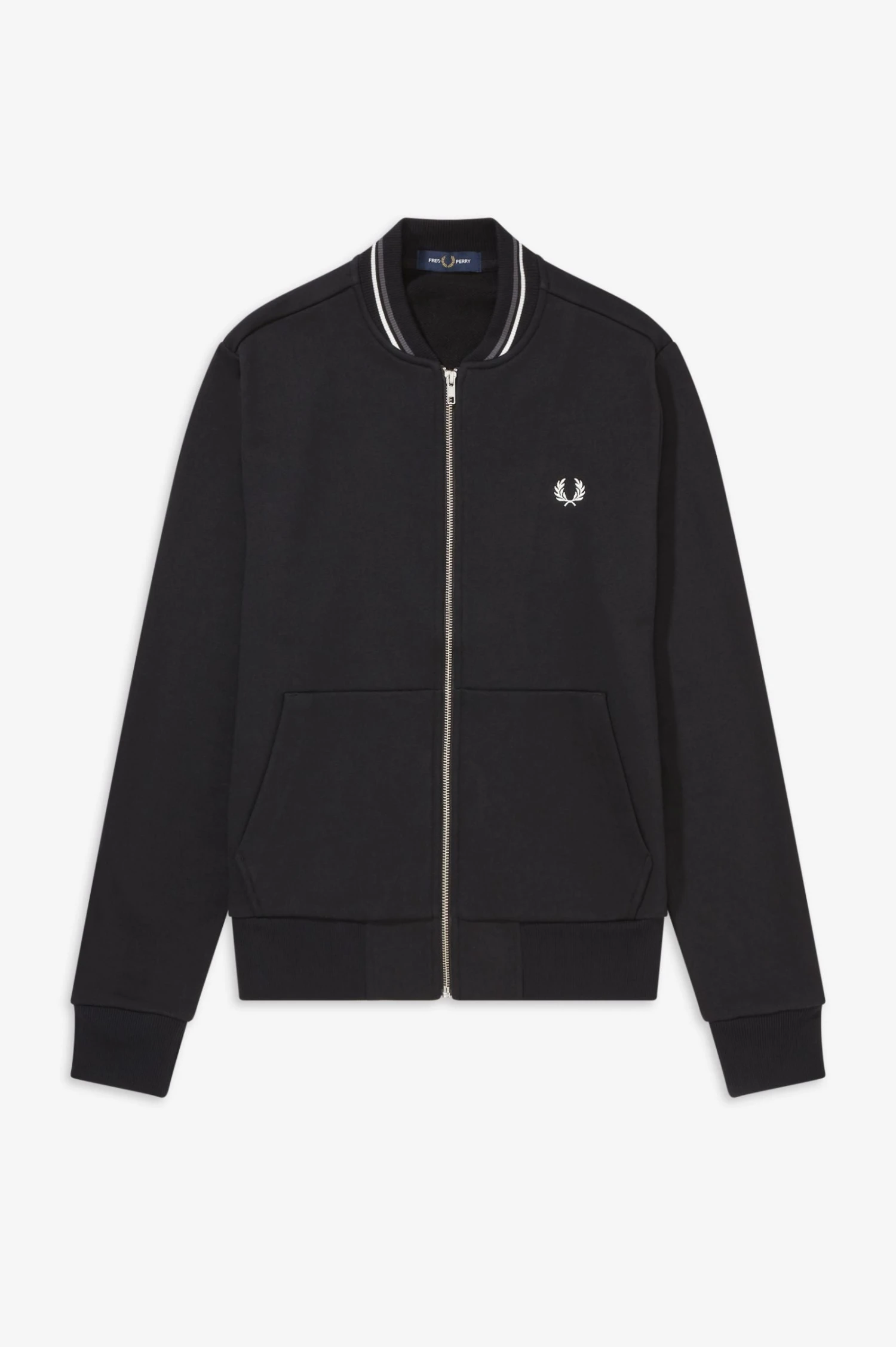 A loopback cotton-blend sweatshirt, designed with the same silhouette as our tennis bomber. Loopback cotton-blend sweat / Regular fit / Tipped bomber neck / Ribbed trims / Metal zip