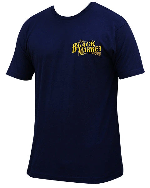 Golden Cobra Artwork by Tim Hendricks, Yellow Ink on Navy Blue Tee. Features artwork large on the back, and small upper left chest piece with BMA logo.