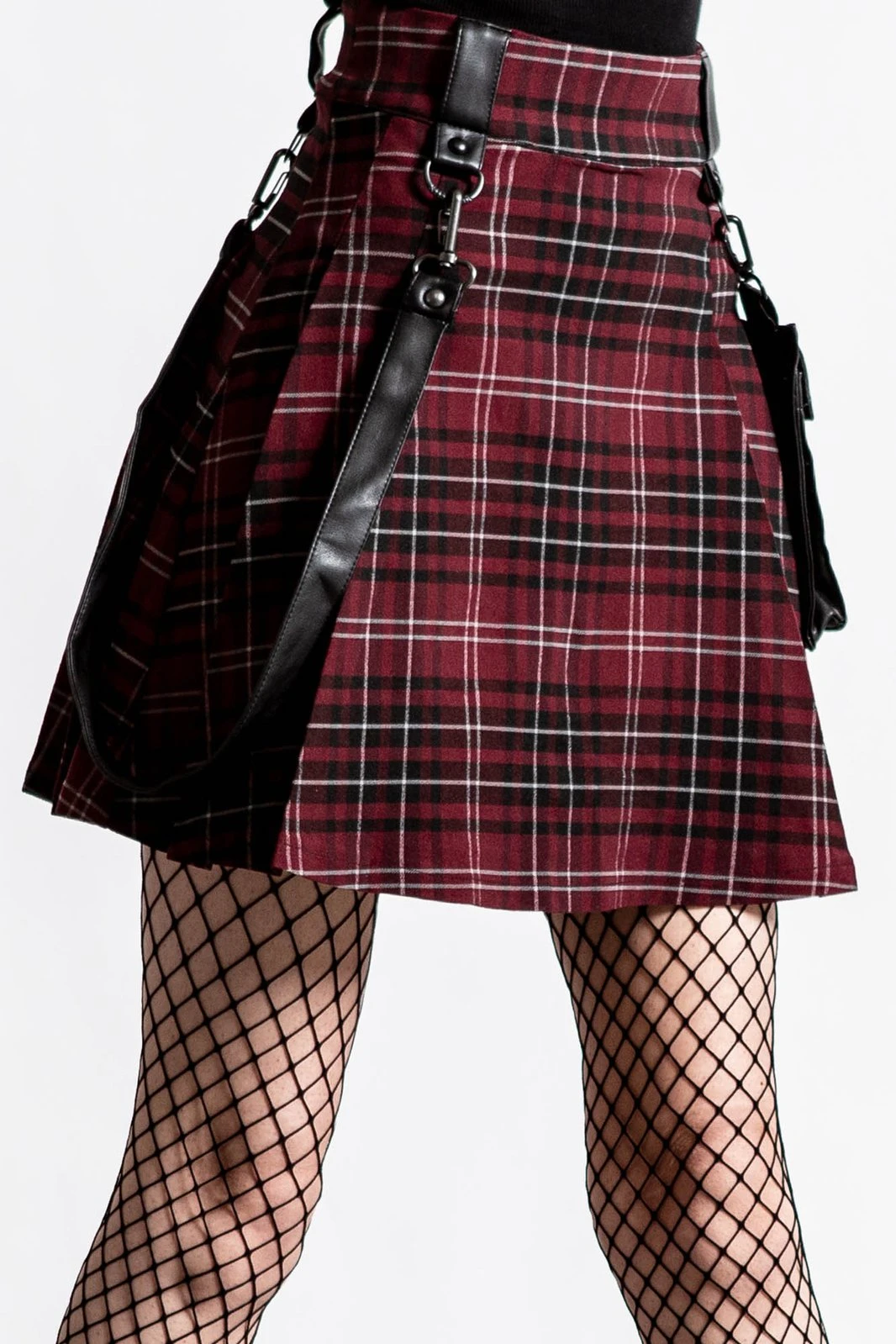 Make a statement in our ‘Gunner’ pleated skirt. This rockin’ skirt is conjured from super-soft woven fabric with some stretch for the perfect fit. Features a blood tartan print, a pleated design, small side pouch and silver hardware. It’s the must-have skirt!