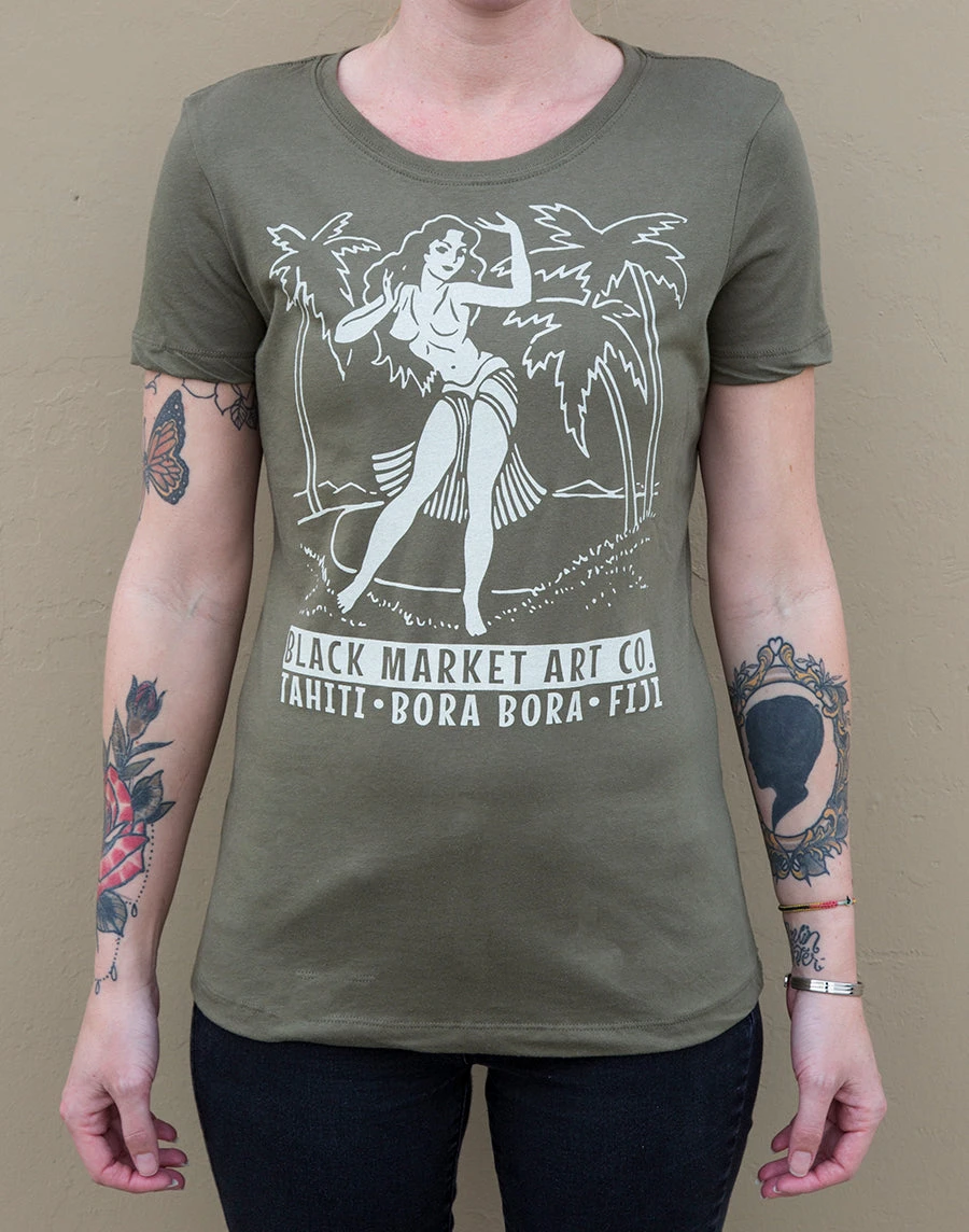 Feel like the babe you are in this adorable tee featuring a classic hula girl ready to shake her stuff! White ink, on a military green fitted tee