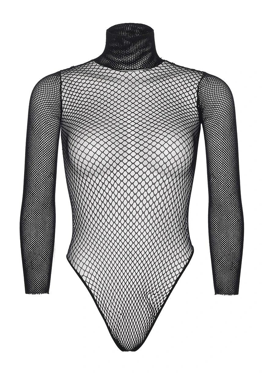 Sexy AF – Fishnet high neck long sleeved bodysuit with snap crotch