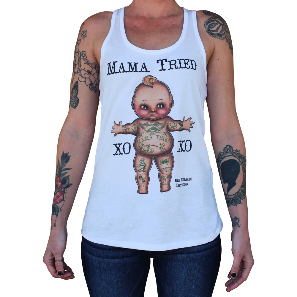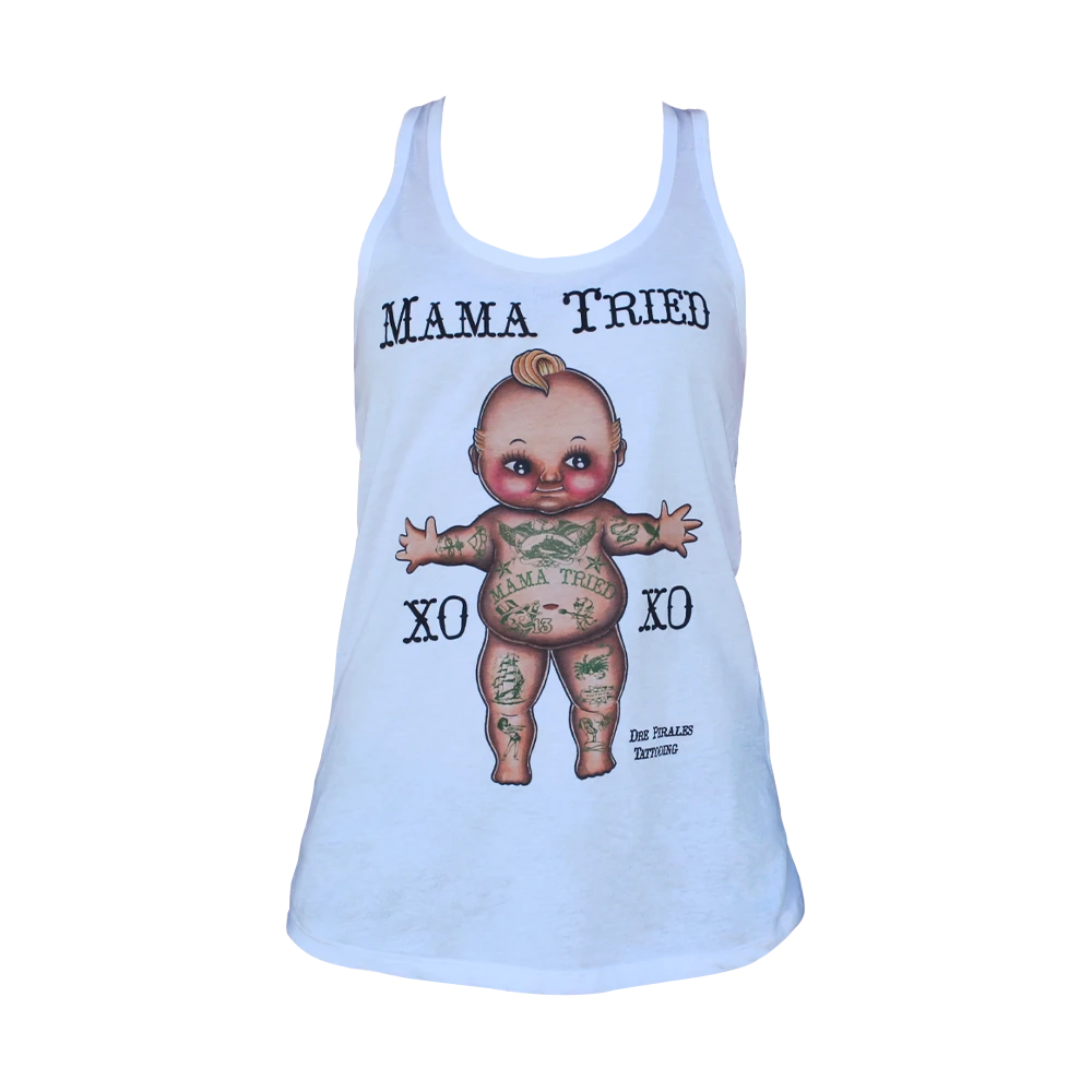 Mama Tried! Tattoo flash artwork on a racer back white tank with full color frontal print