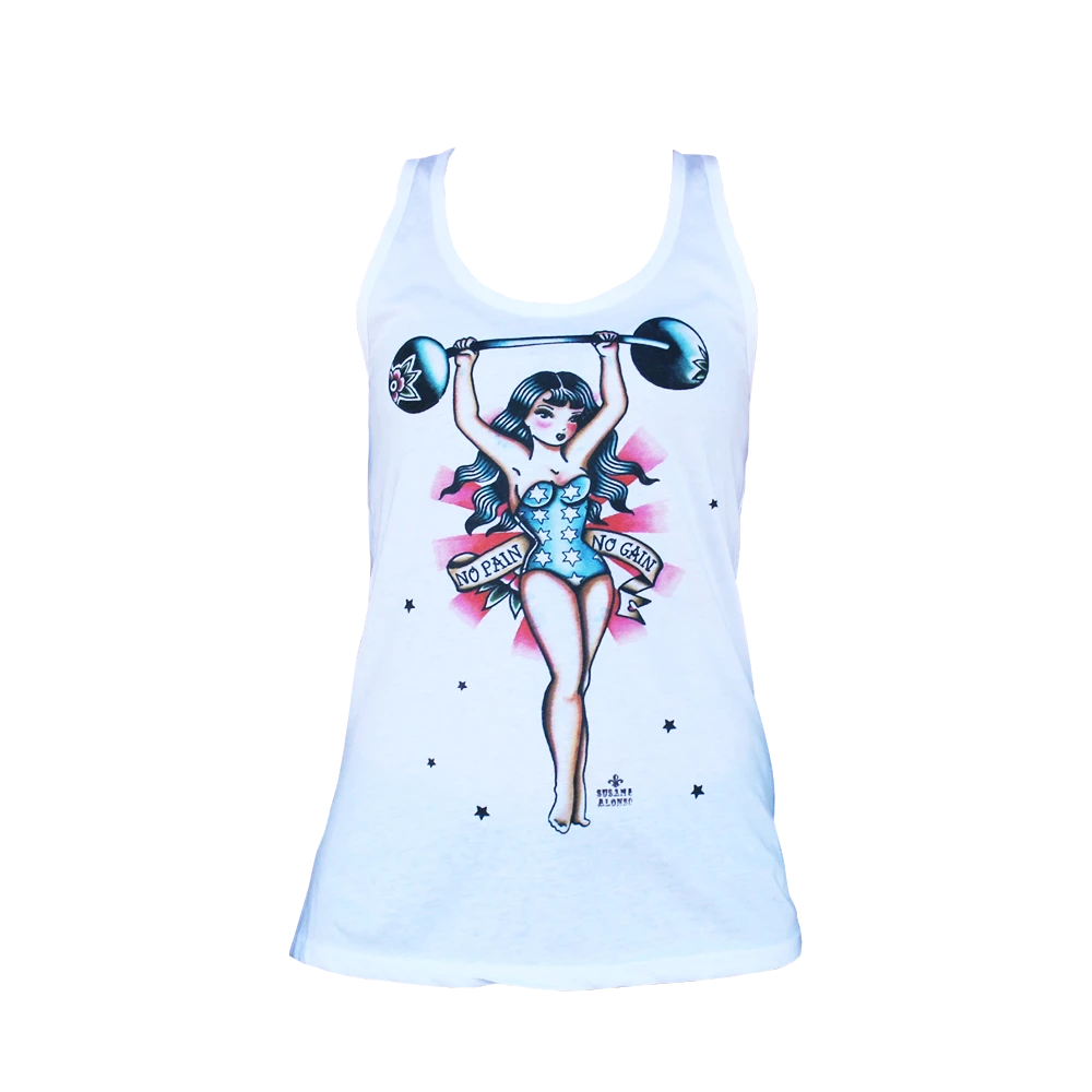 No Pain No Gain Babe! A tattoo flash weight lifting babe on a racer back white tank with full color frontal print