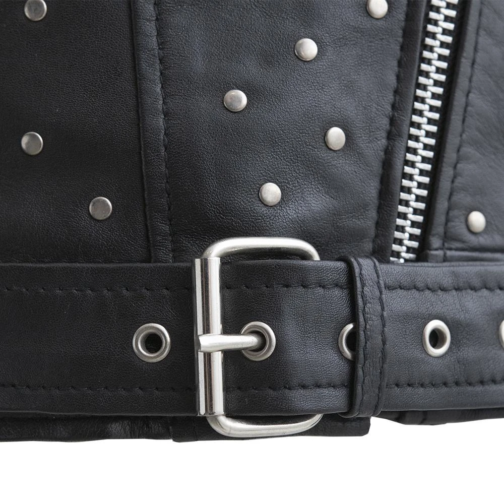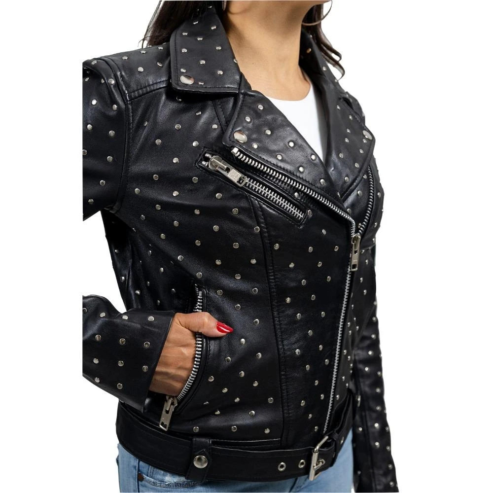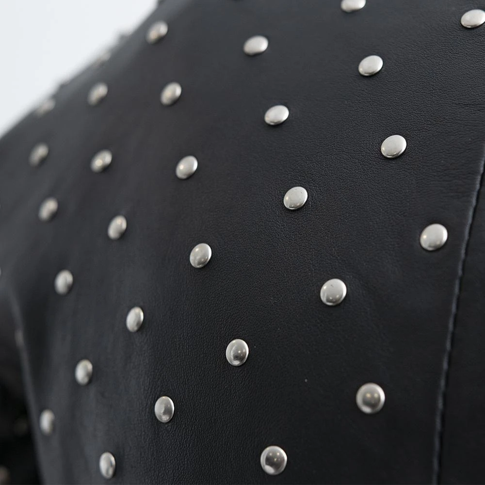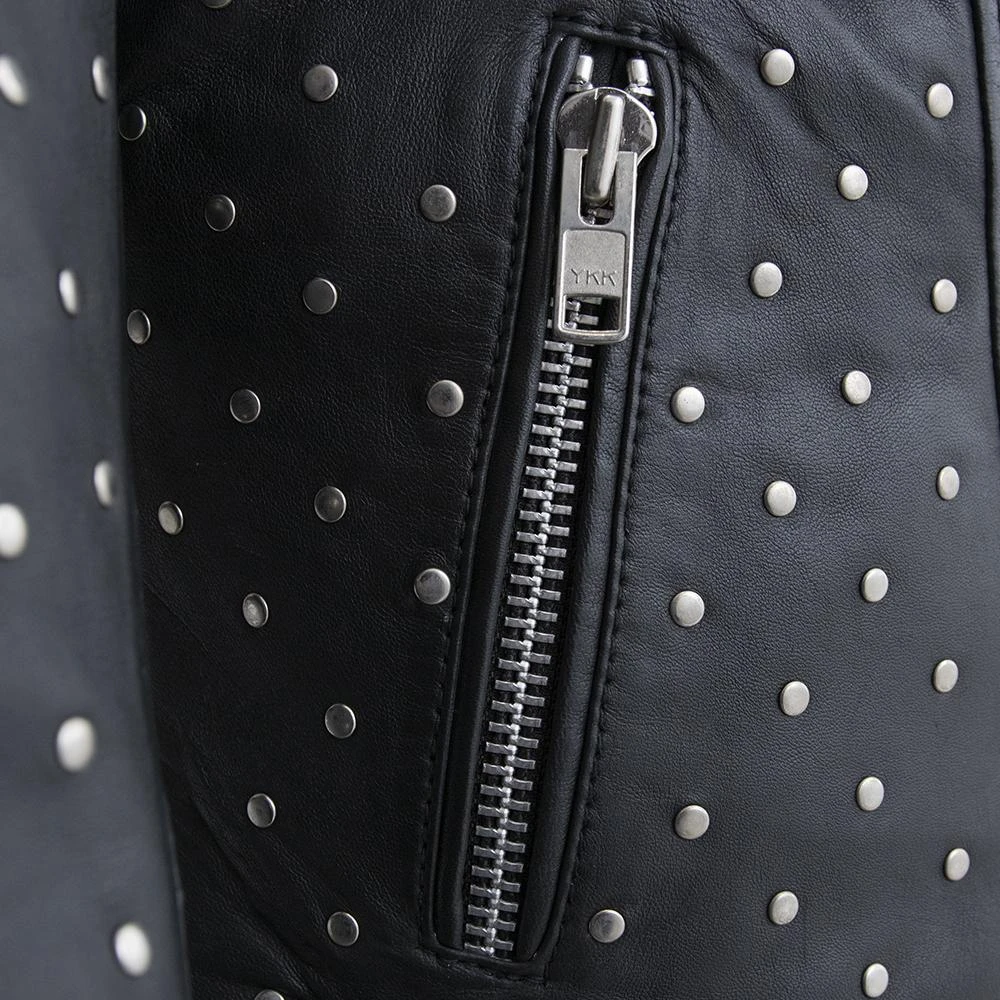Looking for a head turning piece that will always make you stand out in a room? This studded up jacket is for you! Featuring a classic motorcycle style neck line, SUPER soft lambskin leather, zipper front, and pockets in all the right places!