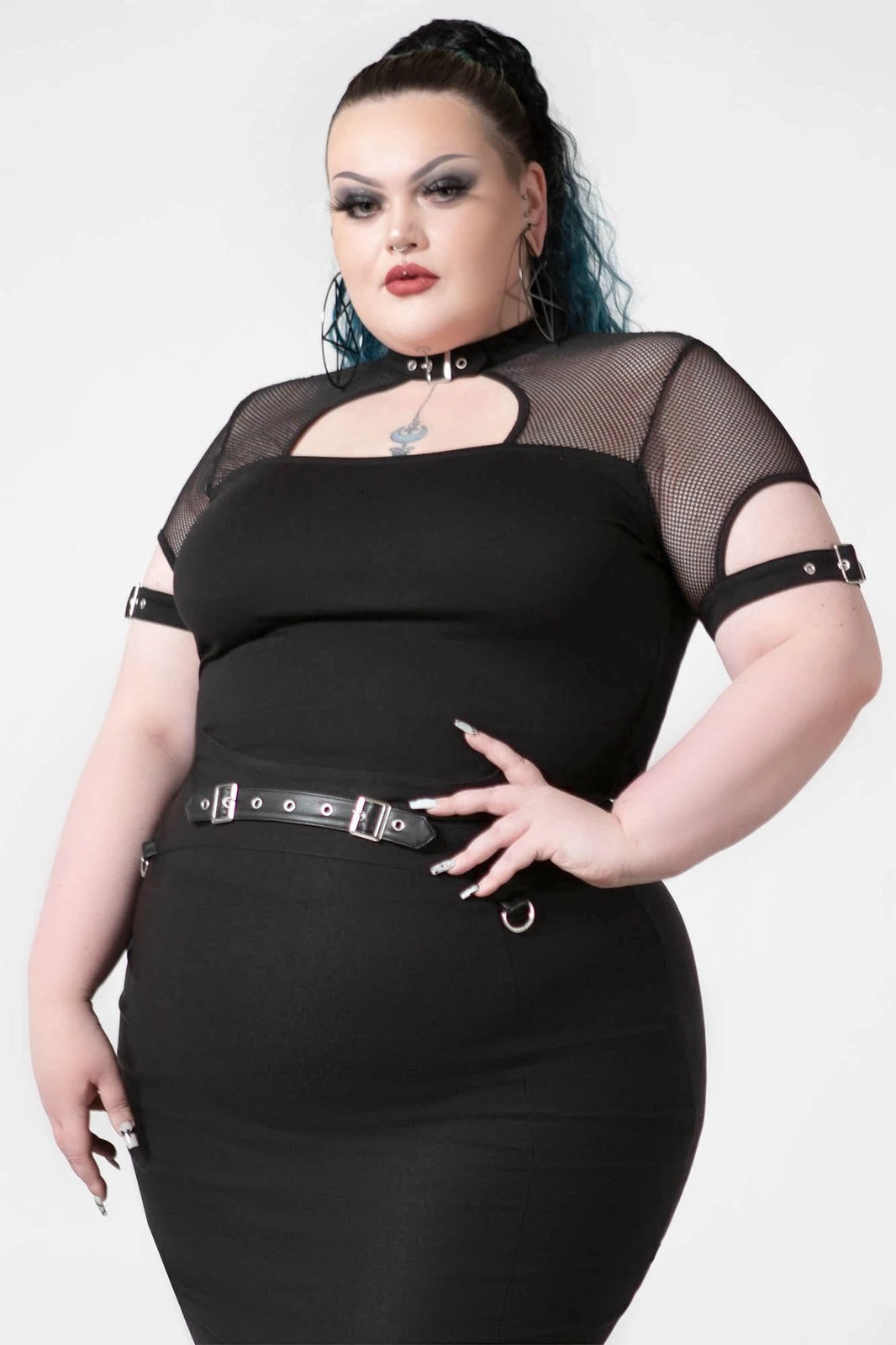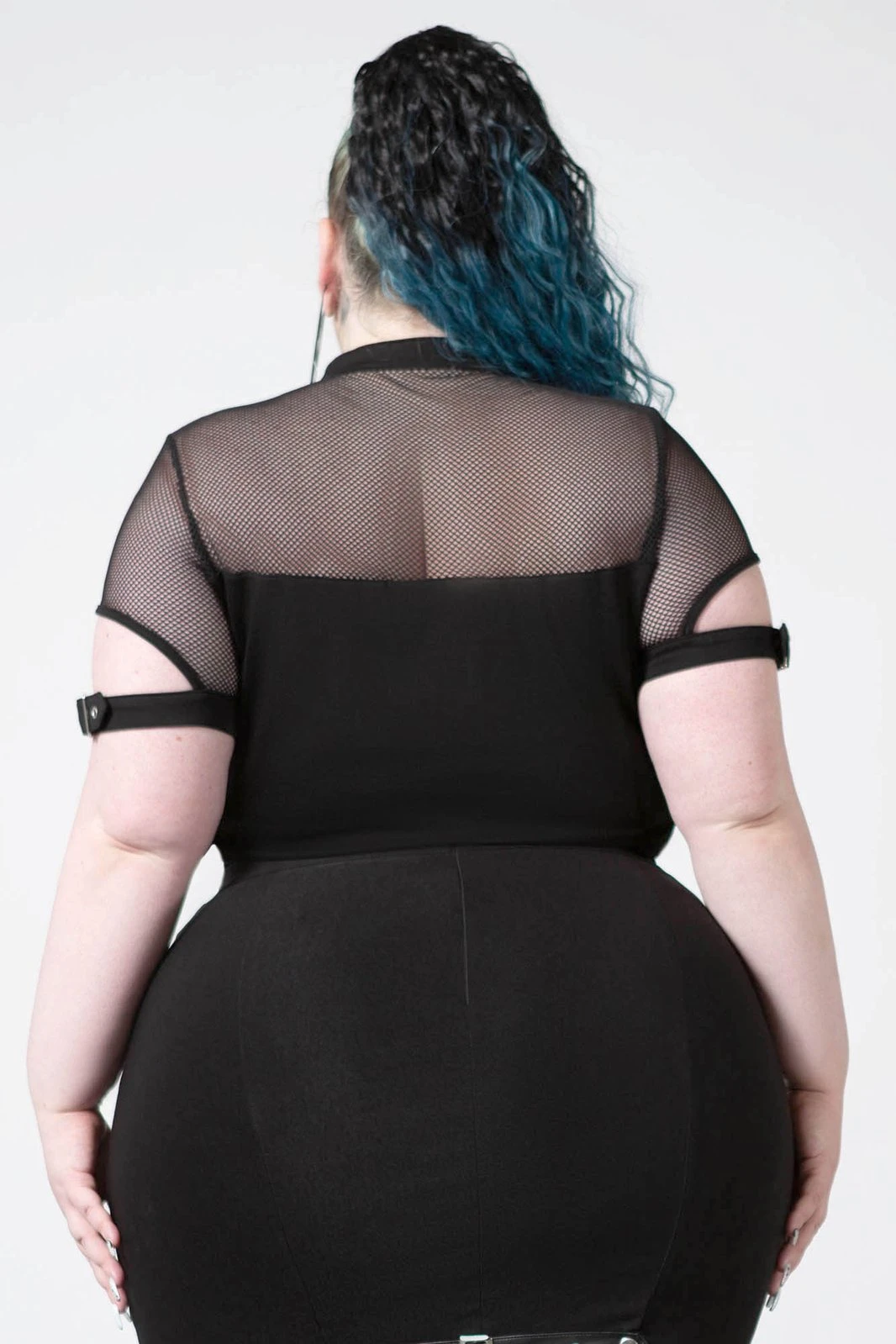Hell yeah – Mesh! The ‘Parish’ mesh top is composed of a super-soft mesh panel and statement jersey body, short sleeves with cut-out detail and a high neck with buckle accent. Easy to wear and very versatile.
