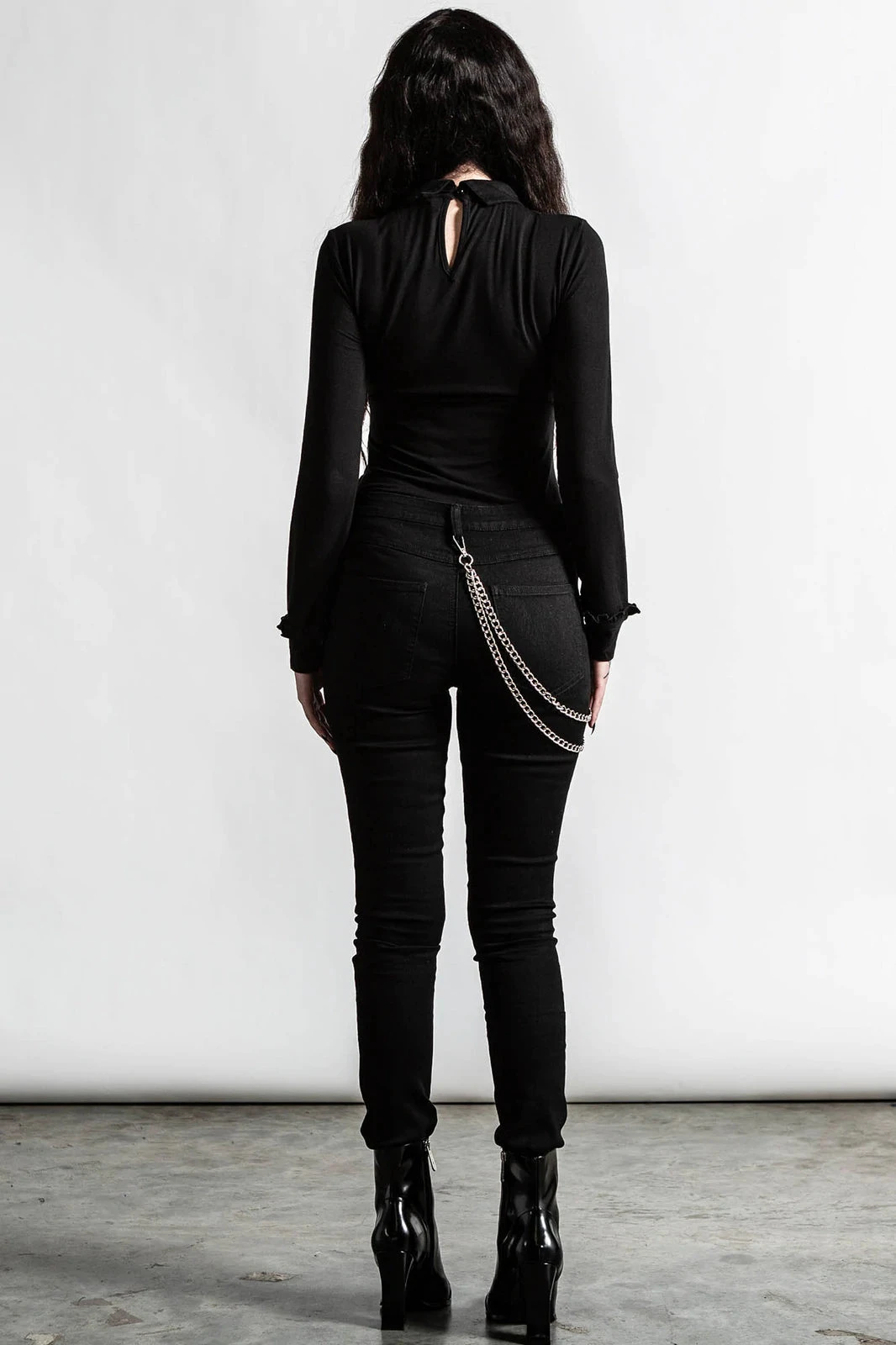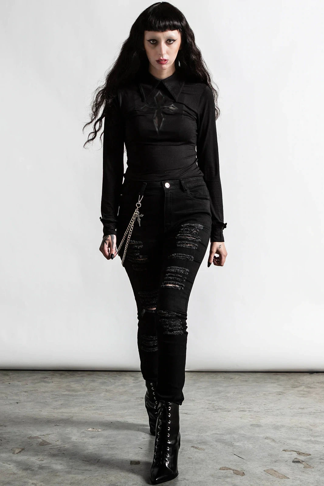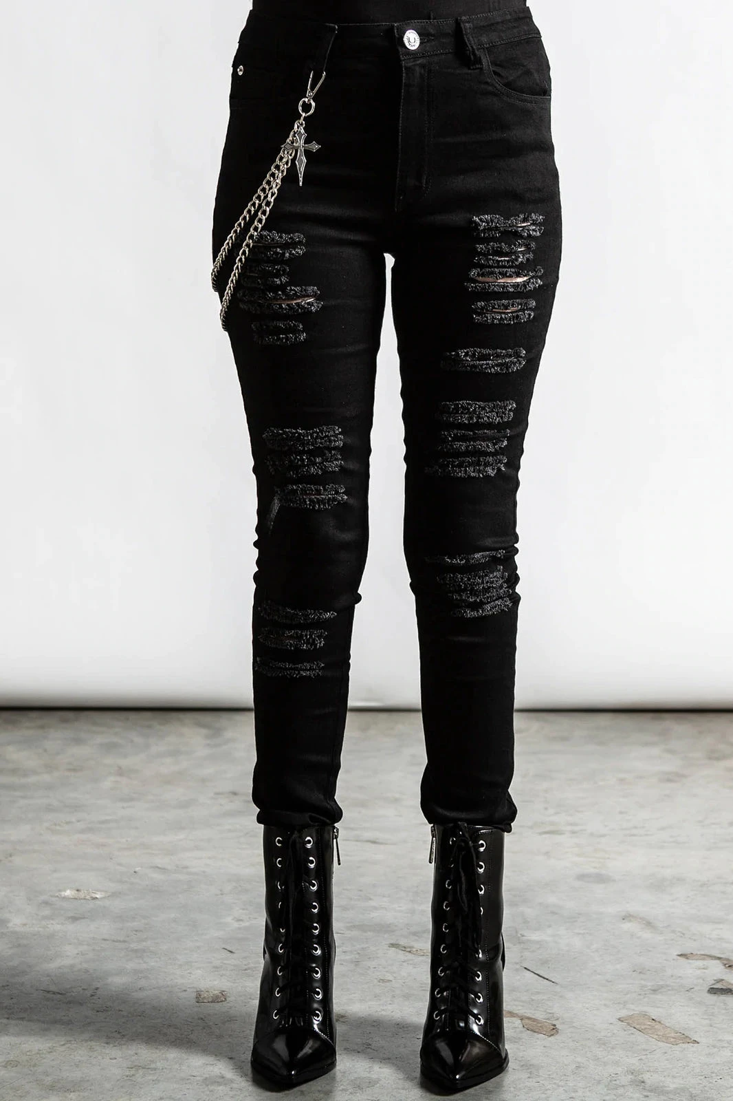 It’s better to burn out than fade away. Be all you wanna be in the ‘R.I.P.’ slash jeans; made using luxe denim which stretches to perfection for a body huggin’ fit that will have you feeling badass! Features distressed detail + chain with cross pendant. Looks rockin’ dressed up or down – whatever your angsty heart desires!