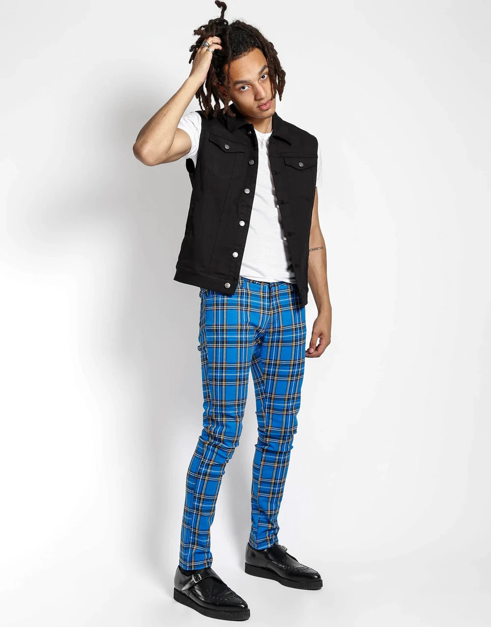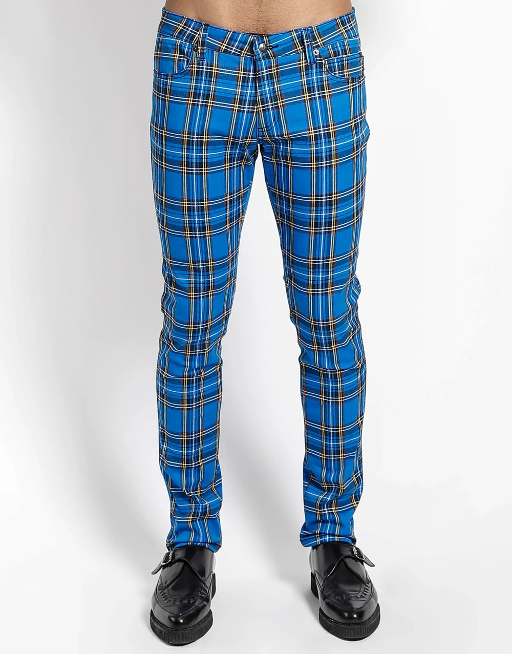 Tripp NYC’s signature men’s skinny printed rocker jean in royal plaid features classic five-pocket slim fit stretch denim with silver rivets, zip fly & button closure.
