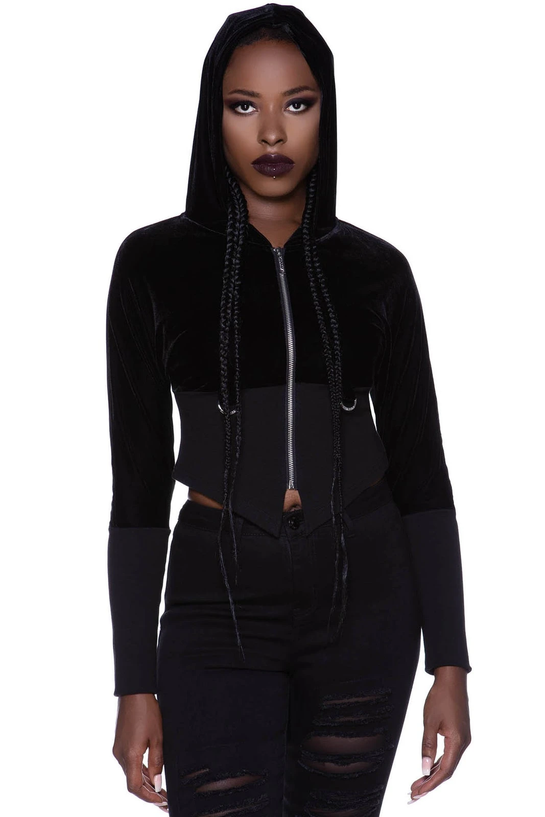 Black as yer heart! ‘Shadow Shift’ hooded top is the ultimate combination of style+ comfort. Made using a super-soft stretch jersey for a flattering yet comfortable fit – complete with oversized hood, long fitted sleeves, exaggerated rib detail and d-rings. The perfect lil’ staple crop for completing yer fav dark looks – looks great dressed up or down depending on yer mood!