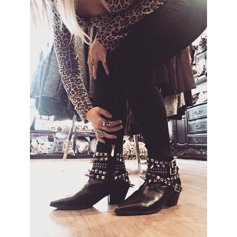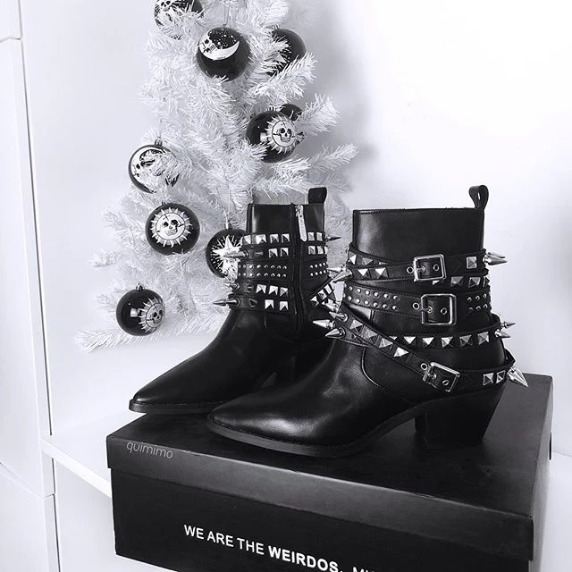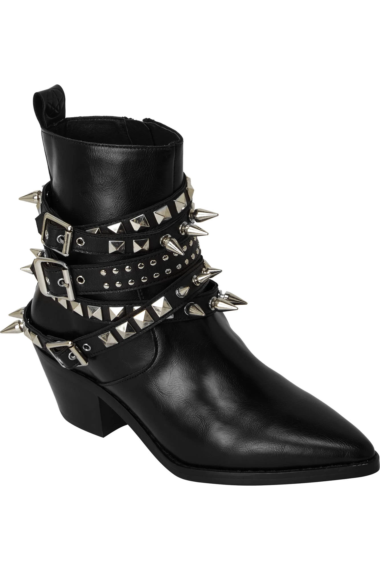 The ‘Callista’ pointed biker boot ticks all yer boxes; faux leather body with a classic shape, elevated with a 2″ heel and zip sides for easy on/off. Complete with a statement-strap feature – with a mix of studs, spikes, and buckles. A perfect everyday boot; match with your fav leggings and tops.Â