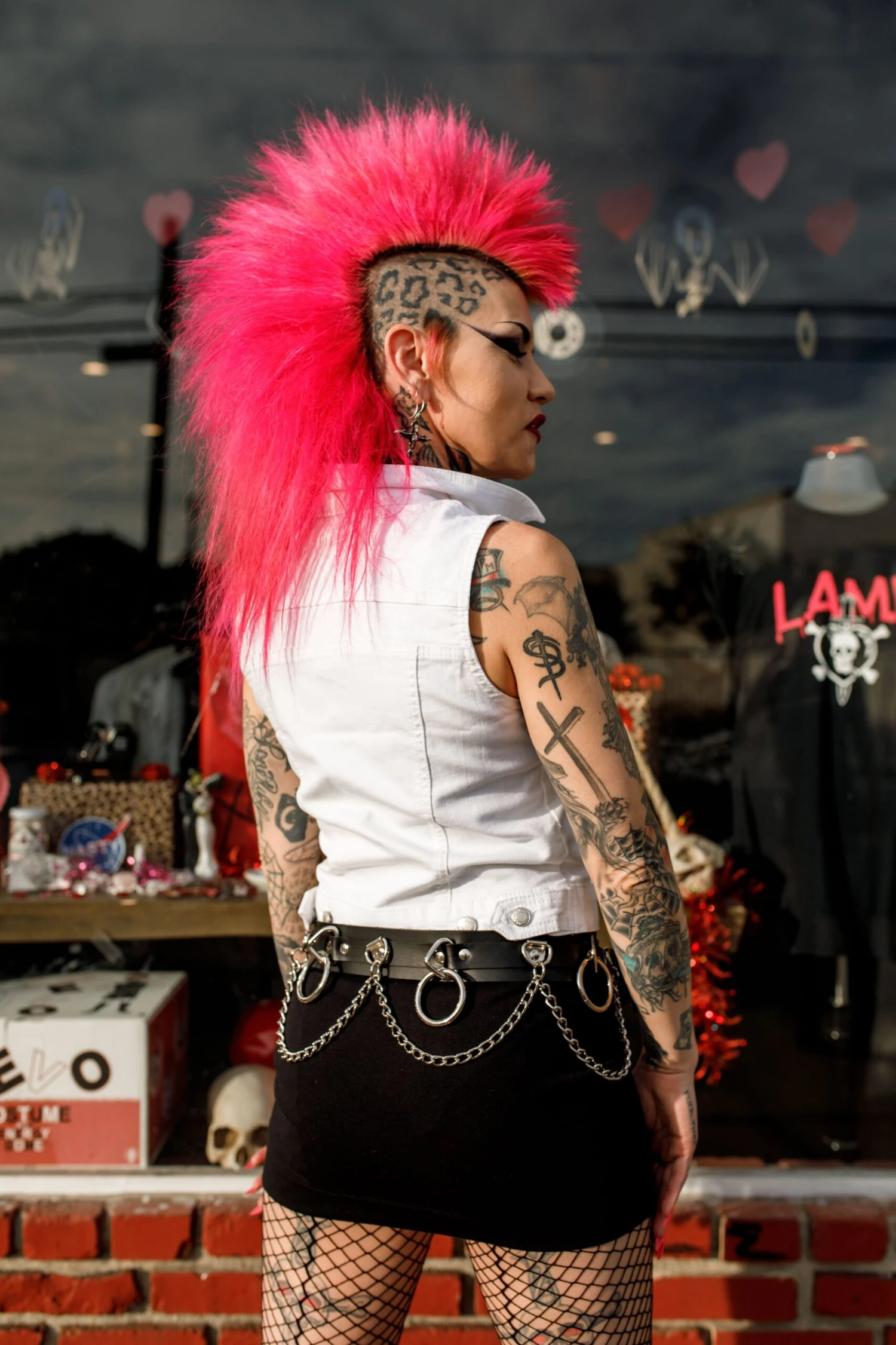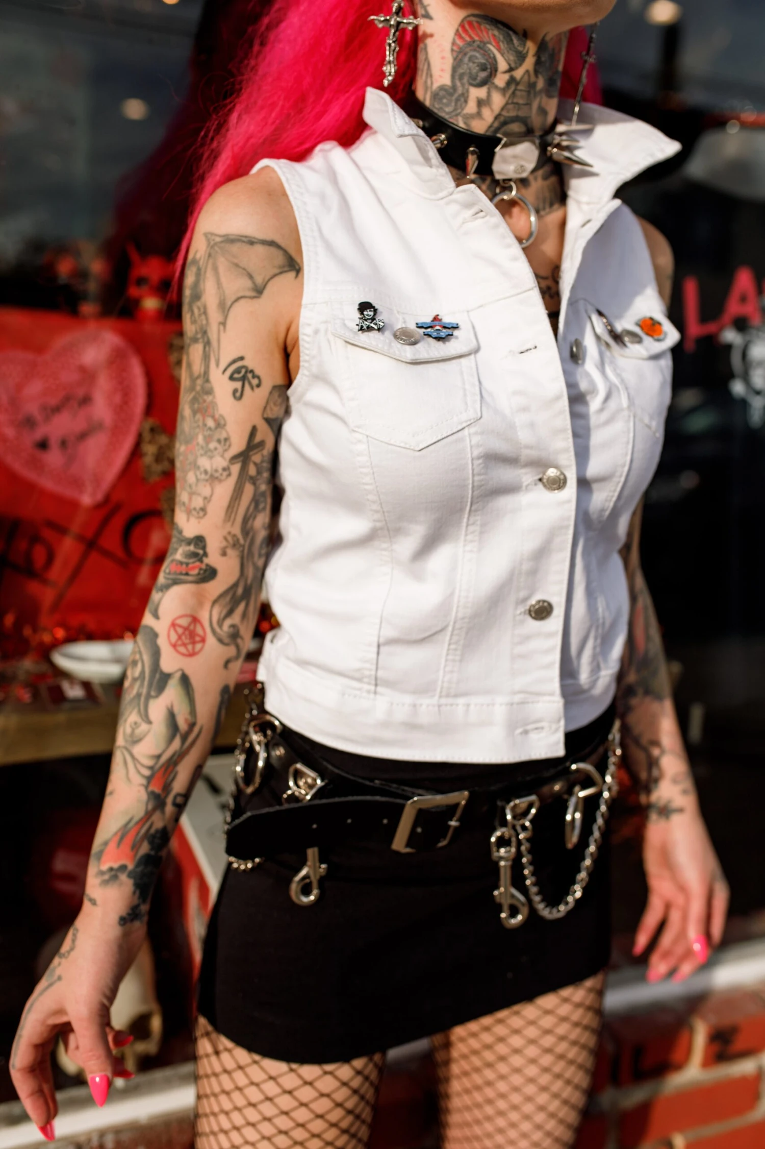 This killer vest is a punk rock gal staple. Super fitted, with frontal top pockets, this baby hugs your curves and completes any outfit. Add some pins, patches, studs, or rock as is. The perfect amount of stretch & cropped at just right length.