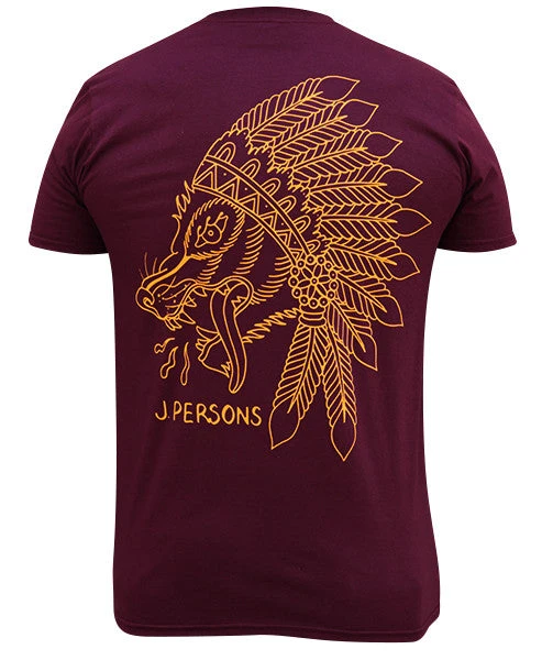 Wolf Spirit Artwork by Josh Persons, Yellow Ink on Maroon Tee. Features artwork large on the back, and small upper left chest piece.